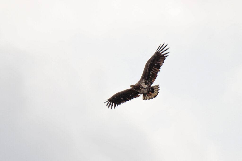 Dan gaan we door naar een doodlopend stukje waar we van de fiets afstappen. Daar zien we twee zeearenden jagen. Duizenden vogels vliegen op de lucht in en… jawel… een zeearend pakt een brandgans als maaltijd. Het is en blijft prachtig om de koning onder de Nederlandse vogels te zien zweven, slechts af en toe onderbroken door een vleugelslag. Dan betrekt de lucht snel en trekt een korte maartse bui over. Onder een uitzichtpunt hebben we enige beschutting tegen de regen. Maar we zijn toch waterrotten in de Biesbosch?! Na een minuut of wat wordt het lichter en breekt de zon weer door.